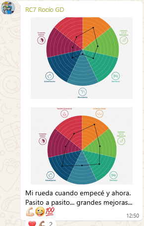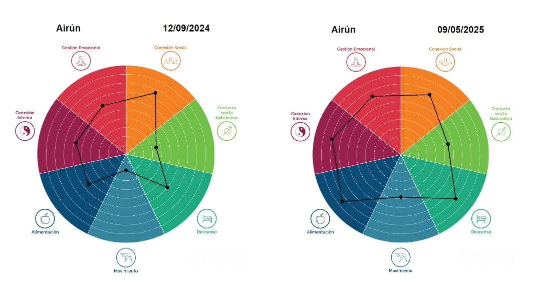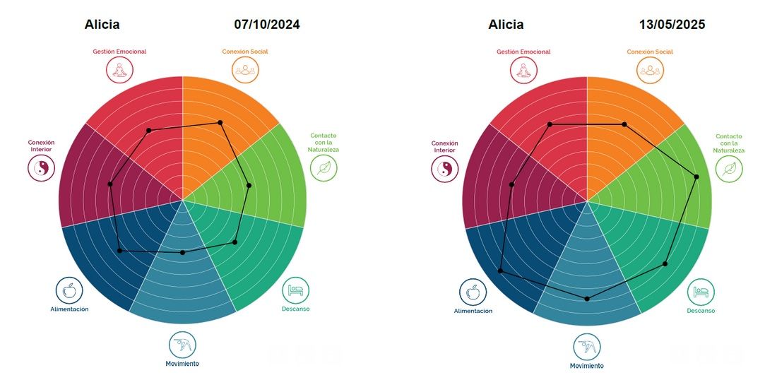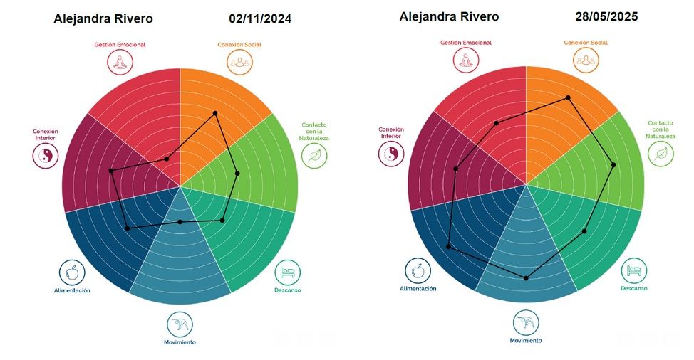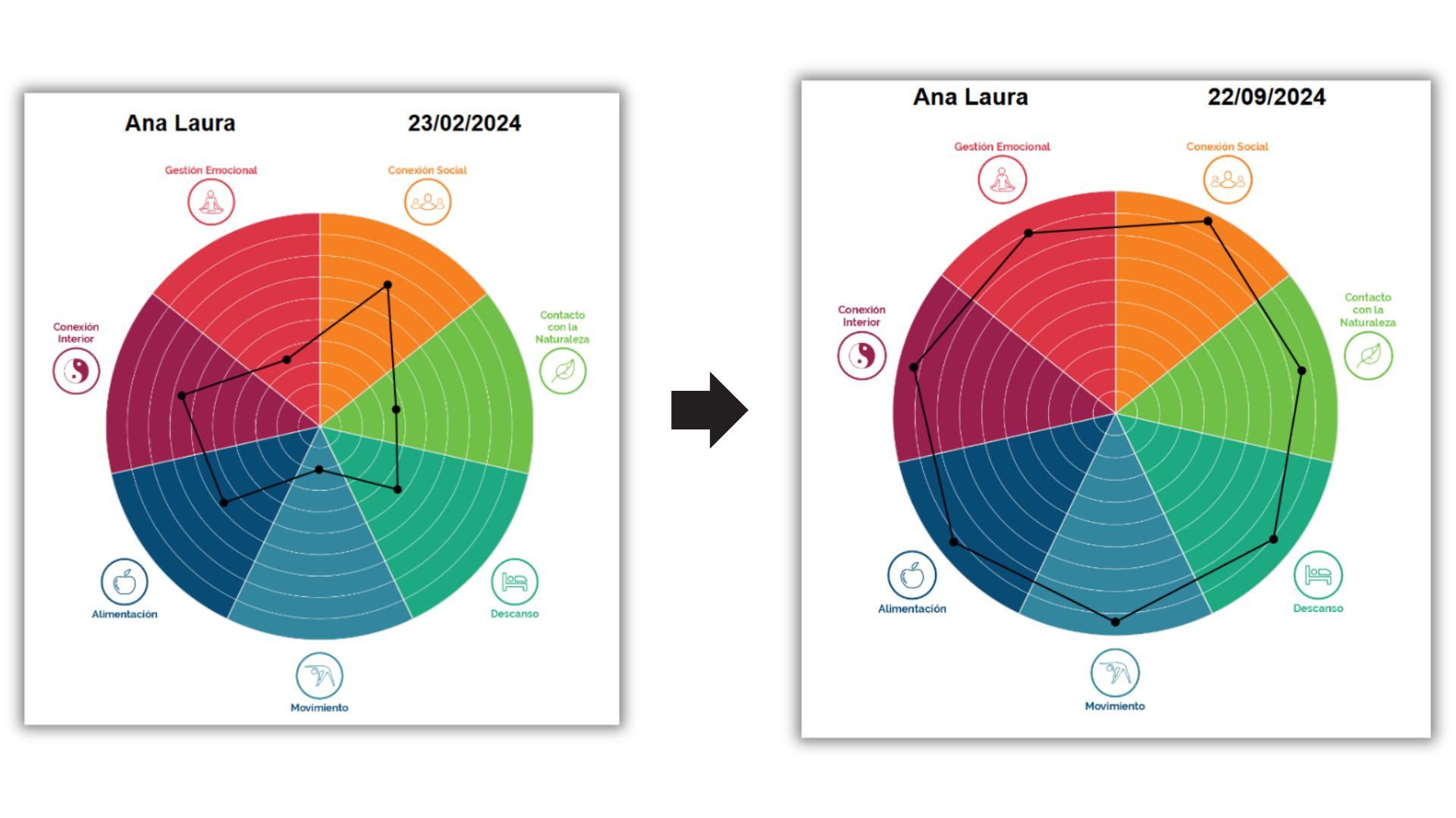 Durante el programa Ana mejoró de manera increíble en las 7 áreas de la Salud Natural, como puedes ver en sus dos Ruedas de la Salud, lo que le ha permitido sentirse mejor a todos los niveles: