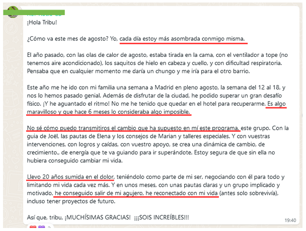 Llevaba 20 años sumida en el dolor, limitando mi vida cada vez más. En unos meses, con unas pautas claras y el apoyo del grupo, he reconectado con mi vida. Incluso he superado desafíos físicos que hace 6 meses consideraba imposibles.